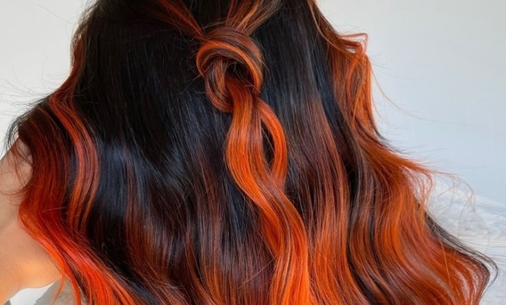 Для этого образа парикмахеру нужно будет "смешать" на волосах корни цвета черного дерева с оранжевыми, красными и желтыми тонами по всей длине.