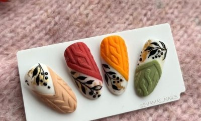 Трендовый вариант — это когда часть ногтя "одета в свитер", выполненный с помощью цветной акриловой пудры, а вторая часть имеет рисунок. Это может быть осенний овощ, гриб, листок или желудь.