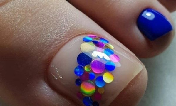 Конфетти можно добавлять на любой цвет ногтя. Например, светлый цветной декор красиво смотрится на темном педикюре. И наоборот. А еще на большом ногте можно сделать прозрачную полоску и разместить в ней украшение.