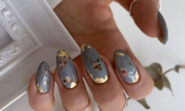 Очень стильно и изысканно будет выглядеть серый маникюр с золотыми или серебряными вставками. Вы можете попросить мастера нарисовать разнообразные узоры или линии. Также стильно будет выглядеть серый дизайн ногтей с фольгой.