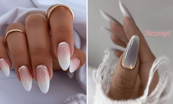 Для любительниц блесток подойдет молочная заливка сверху, которая заглушит яркость, но оставит праздничный эффект. На такие пальчики захочется надеть кольцо. А еще к этому маникюру будут подходить любые аксессуары: от скромных, тоненьких, до больших, цветных.
