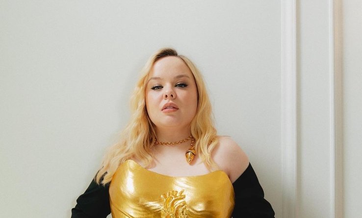 Дополняли образ звезды черные туфли и золотое украшение на шее. Светлые волосы Николы свободно спадали на плечи. Также она сделала макияж с акцентом на глаза.