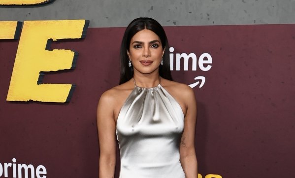 Приянка позировала фотографам в серебристом сатиновом платье без рукавов, с тонкими бретельками и круглой горловиной. Дополнили образ черные туфли на каблуках и украшения. Свои волосы Чопра распустила, сделав средний пробор, и подчеркнула красоту макияжем с акцентом на глазах.