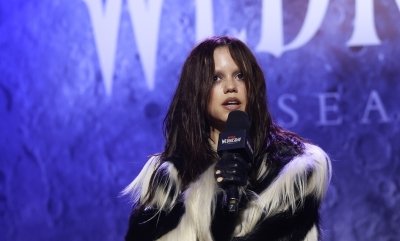 Дженна была одета в черное атласное платье, украшенное кружевом. Поверх него она надела меховое пальто в черном и белом цветах. Дополнили лук черные сапоги со шнуровкой и черные кожаные перчатки с вырезами. Ортега распустила волосы и сделала макияж с голубыми тенями.