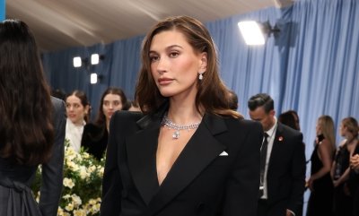 На Хейли было красивое черное миди-платье на тонких бретельках в белый горошек от Dolce & Gabbana. Дополнили лук зеленые босоножки на каблуке с декором в виде солнышка, черная сумка, солнцезащитные очки и украшения. Волосы она собрала в пучок, оставив несколько прядей спадать на лицо, и сделала нежный макияж.