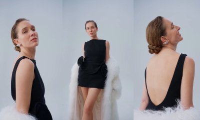 В кадре телеведущая предстала в черном мини-платье без рукавов и с открытой спиной от польского бренда Magda Butrym. Талию наряда украшала объемная декоративная каркасная деталь в виде цветка и волана.