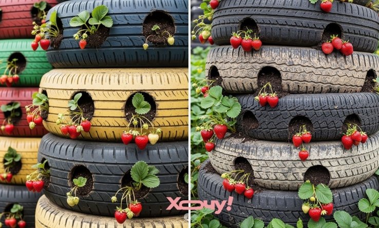 Берем шины и ставим их друг на друга. Не пытайтесь построить гору к небу, 5-7 единиц вполне достаточно. Далее нужно сделать по периметру каждой шины небольшие отверстия, а середину заполнить землей. Тогда сажаем в каждое отверстие рассаду и хорошо поливаем. С таким огородным лайфхаком вам не нужно будет пропалывать грядки, на ягоды будет попадать достаточно солнца и собирать клубнику станет настоящим удовольствием. А если раскрасить шины, то у вас будет мгновенно подниматься настроение при взгляде на них.