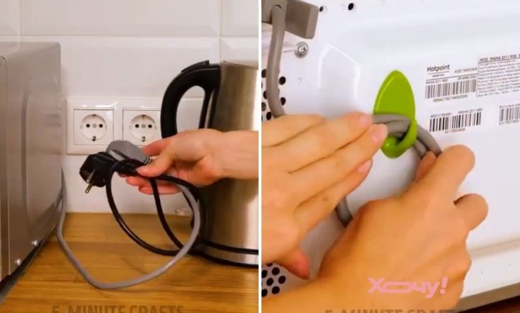 Все, что понадобится для работы – 5 секунд вашего времени и пластиковый крючок. Такой крючок можно приобрести в хозмагазине. Часто на них вешают кухонные полотенца. С плоской стороны крючка есть липучка и все, что нужно сделать, это приклеить его сзади микроволновки и намотать провод на крючок, чтобы не мешал. Это сэкономит место, все будет выглядеть опрятно и глаза не мозолит постоянно свисающий провод.