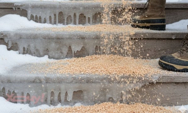 Древесная зола и опилки. Она абсолютно безопасна для обуви и лап животных, а еще является естественным удобрением для земли. Золу смешивают с песком, а опилками посыпают ступеньки.