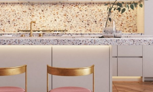 Если вы не любите стандартный декор, обратите внимание на террацо. Мелкие вставки кусочков плитки выглядят стильно, необычно и одновременно уютно. Ранее мы писали, как сделать кухню в красном цвете, а теперь расскажем, как давно забытое террацо может стать изюминкой интерьера.