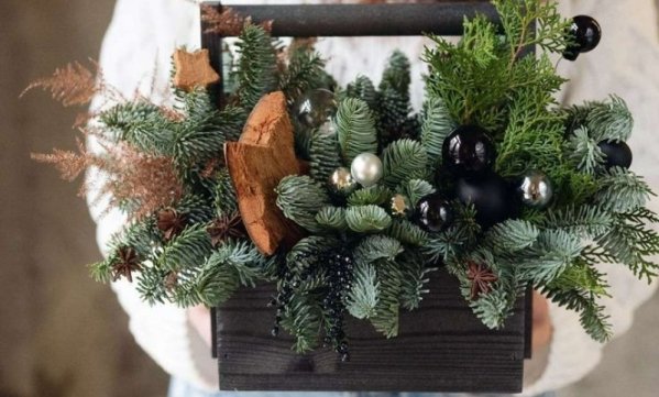 В декоративный ящик выложите красивую бумагу или фольгу. Туда разместите пенопласт, в который легко зафиксировать декор: елочные ветки, декоративные веточки деревьев или кудрявой ивы. Добавьте новогодние шарики, свечу, праздничного оленя или Санта Клауса. Все клеится на горячий клей.