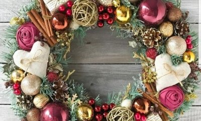 Главное для новогоднего венка — праздничные детали. К ним относятся красная машина с елкой, наряженная елка, статуэтка Санта Клауса, блестки и снежинки. В моде — сюжетные венки, с колокольчиками и искусственными ягодами, сушеными кольцами лимона и палочками корицы.