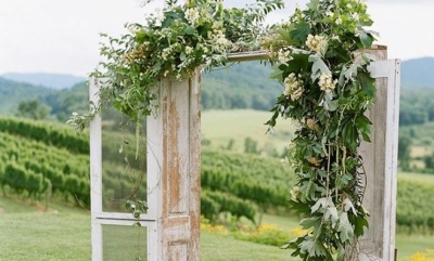 Актуально дополнять арку искусственными цветами и дождиком из бусинок. При этом искусственные цветы можно сделать собственноручно из металлического проволоки и органзы. Или же из гофрированной бумаги.