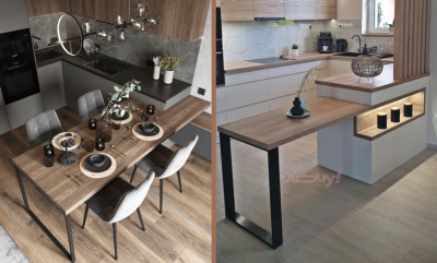 Дизайнеры показали нестандартные решения для кухни. Это столы необычной формы, столы-трансформеры и столешницы, которые превращаются в стол. Такой дизайн будет подходить к любому стилю кухни. Он добавляет изюминку в интерьер своей необычностью и удобством. Многие идеи подойдут для кухни, где мало места.