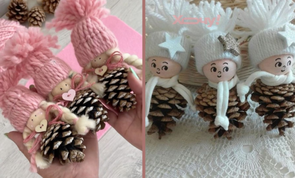 Такой декор будет уместен и для осени, и на зиму. Это куколки из шишек, одетые в шапки. Они имеют дорогостоящий и креативный вид. В то же время, их можно легко и быстро сделать за копейки. Выбирайте любые цвета для такой отделки и размеры. Куколок можно повесить на елку, окно, ветки в вазе или дополнить ими декоративный венок.