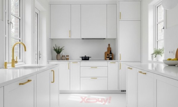 Золото в интерьере может быть хорошим акцентом, если его не слишком много. Избыток может выглядеть вульгарно. Золото хорошо сочетается с белыми минималистичными фасадами. Альтернативой станут ручки из латуни, старой бронзы или меди.