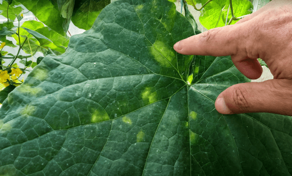 Дачник показал, как выглядели больные огурцы за два дня до обработки. За это время болезнь распространилась на все листья. Главный характерный признак – пятна на листьях неправильной формы, желтые и словно “зажатые” между жилками. Эти пятна постепенно распространяются, увеличиваются и затем соединяются друг с другом.