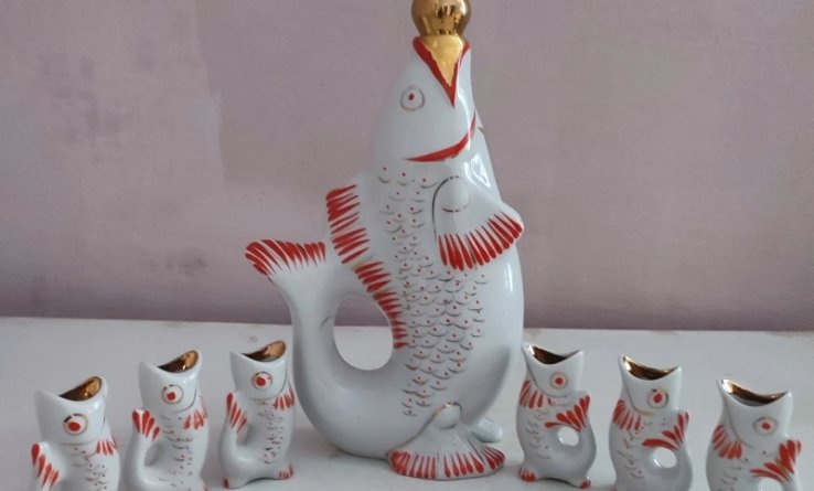 Сервиз состоит из большого карпа и 6 фарфоровых маленьких рыбок. После открытия бутылки алкоголь переливался в большого карпа, объем которого 0,7 л, а объем малых рыбок, которые выполняли функцию стопок - 30 мл. Для большинства этот сервиз служил простым сувениром, потому что пользоваться им было неудобно из-за вытекания жидкости.