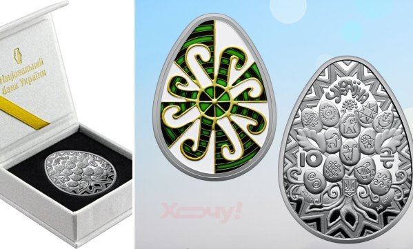 Это первая памятная монета выпущенная НБУ, повторяющая по форме пасхальную писанку. Номинал монеты – 10 гривен. Она изготовлена из серебра 999 пробы, а масса драгоценного металла – 31,1 г, украшена эмалью и локальной позолотой. Дизайн этой уникальной монеты создала дизайнер Александра Кучинская. Тираж монеты – всего до 15 000 штук.