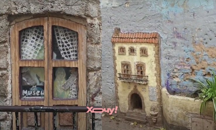 Дом украшен цветочными ящиками, имеет два этажа, небольшой балкон и внутренний дворик. Если внимательно присмотреться к окнам, то можно увидеть фотографию Чарльза Чаплина, смотрящего в окно.