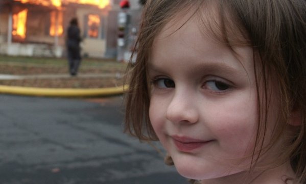 Культовый мем "девочка-катастрофа" (Disaster Girl) с 5-летней малышкой, которая с таинственной улыбкой наблюдает за пожаром, известен во всем мире не меньше, чем "успешный малыш". Эта фотография стала символом иронии и черного юмора в интернете, а ее героиня — Зои Рот — до сих пор узнаваема по всему миру, хотя и с момента создания легендарного фото прошло уже 19 лет!