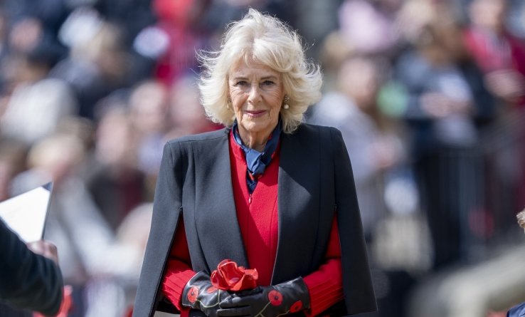 Королева Камилла была одета в красное миди-платье, которое носила в сочетании с коротким кейпом в черном цвете. Дополнили лук черные туфли на каблуках, черные кожаные перчатки, украшенные вышитыми маками, и синий платок с цветочным принтом. Свои волосы Ее Величество уложила в элегантную прическу и сделала красивый макияж.