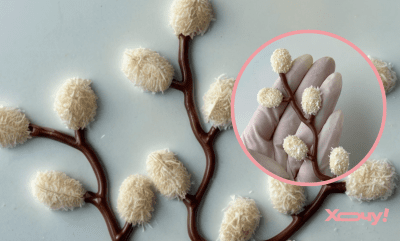 Темперированным белым шоколадом наливаем на веточки соцветия-котики. Пока белый шоколад не застыл, быстро припыляем будущие ивовые веточки кокосовой стружкой. Оставляем до застывания.