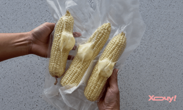 Вакуумируем наши заготовки и запечатываем. В таком виде кукурузу можно хранить в морозилке. Приготовление элементарное. Положите пакет с початком в кипящую воду и убавьте огонь. Готовить кукурузу нужно от 20 до 40 минут.