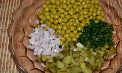 Маринованный огурец просушиваем от лишней жидкости. Также нарезаем тонко. Добавляем его в лук и перемешиваем. Если есть желание, маринованные огурцы можно заменить квашенью – будет тоже очень вкусно.