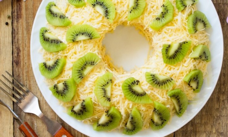 Салат украшаем желтком и остатками киви. Готовую закуску отправляем в холодильник на 50 минут, чтобы хорошо пропиталась.