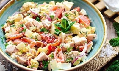 Мелко рубим укроп (можно добавить петрушку). Смешиваем все ингредиенты и заправляем майонезом.
