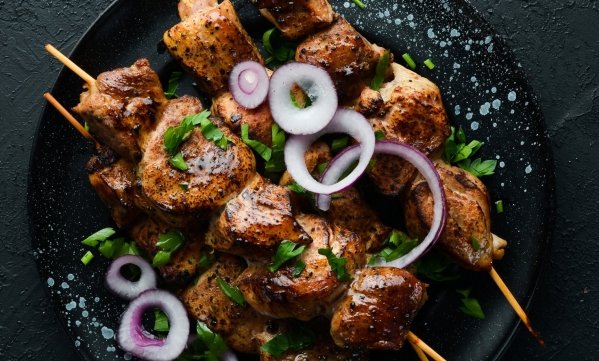 Вынимаем мясо из маринада. Накалываем его на шампуры. Используем остатки маринада для поливки во время жарки шашлыка на гриле или сковороде.