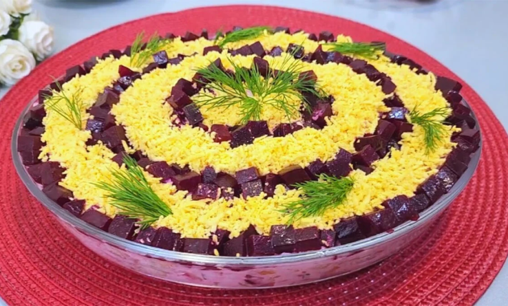 7. Выкладываем в ямки кусочки отложенной свеклы, так же выкладываем по краю салатника. Промежутки между кругами присыпаем натертым желтком.