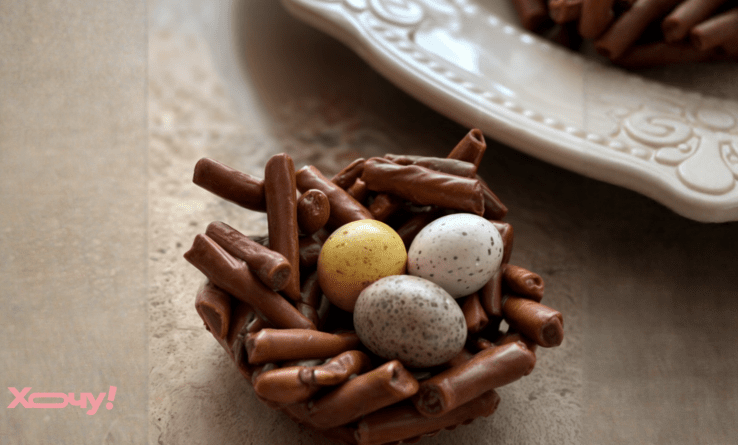 Такие гнезда можно приготовить заранее и затем приклеить их на паски, покрытые глазурью, прежде чем она схватится. Как их сделать, рассказала в своем видео кулинарная блоггерша viktoriia_chui. Вам понадобятся бумажные формы для кексов.