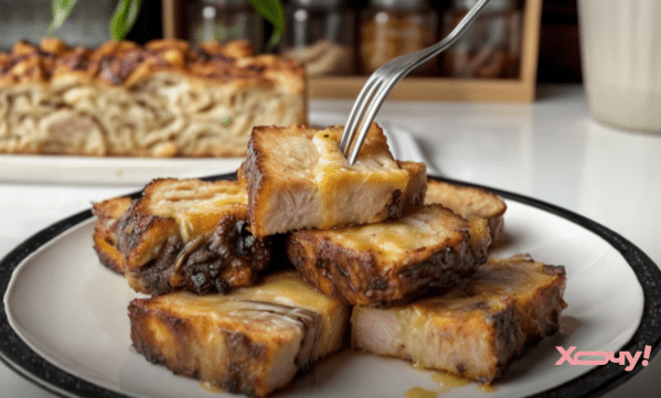 Выпекаем при 200 градусах ориентировочно час. После выпечки полностью охлаждаем. Нарезаем на кусочки, обжариваем и подаем.