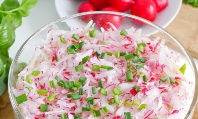 Лучше выбрать прозрачную салатницу, чтобы было красиво. Слоями выкладываем яйца, соус, лук, соус, творог, редиску, а сверху присыпаем зеленью.