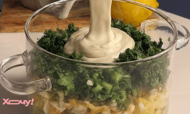 Для заправки смешиваем сметану или йогурт, соль, перец, горчицу, сок лимона. Соединяем все ингредиенты, заливаем 1,5л воды и охлаждаем.