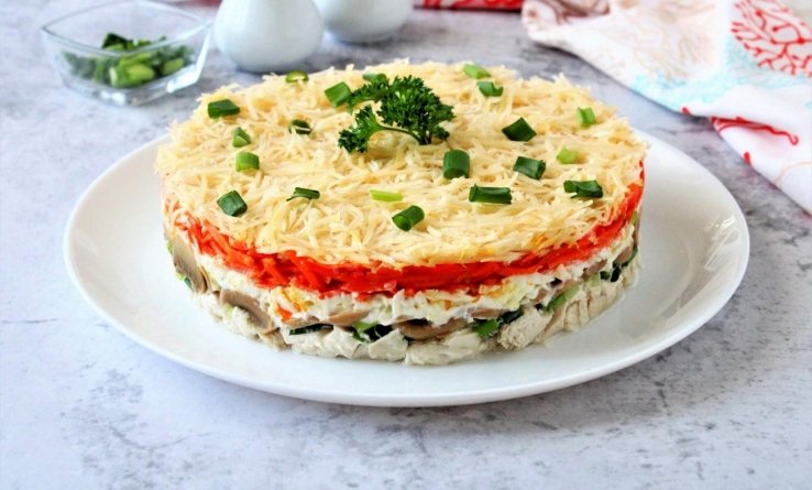 1. Куриное филе отвариваем в подсоленной воде. Охлаждаем, нарезаем кубиками. Выкладываем первым слоем салата и смазываем майонезом.