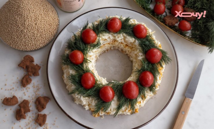 Наверх выкладываем яйца. Украшаем салат укропом и половинками помидоров черри.