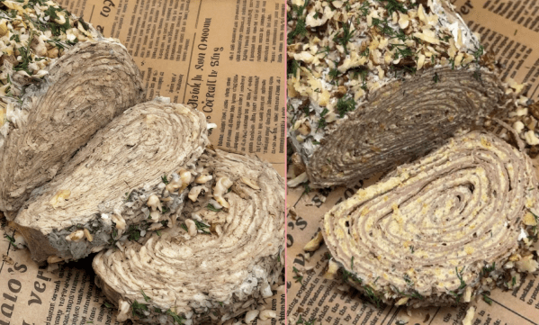 Перед декорированием оставляем в холодильнике на несколько часов, тогда его можно будет красиво нарезать. Смазываем остатками крема. Украшаем зеленью и посыпаем орешками.