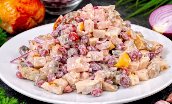 Простые закуски могут быть очень вкусными, даже на праздничном столе. Мы говорили, как приготовить ресторанный салат с печенью. Следующий рецепт можно легко и быстро воспроизвести, если у вас есть кусочек копченой курицы и баночка консервированной фасоли.