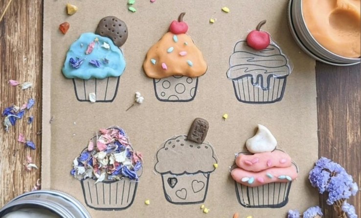 На картоне нарисуйте капкейки. Задача ребенка — "разрисовать" их пластилином. На "крем" нужно выложить немного декора из сухих цветов. Когда картина высохнет, ее можно повесить на стену.
