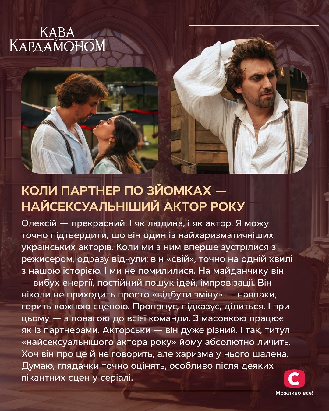 Однако, кроме нее, во втором сезоне «Кофе с кардамоном. Сила земли» увидим и старшую дочь Лавренюк — Полину. Девушка не только сыграла какую-то (пока неизвестно, какую именно — ред.) роль, но и помогала команде с костюмами, а еще ведет ТикТок-канал проекта.