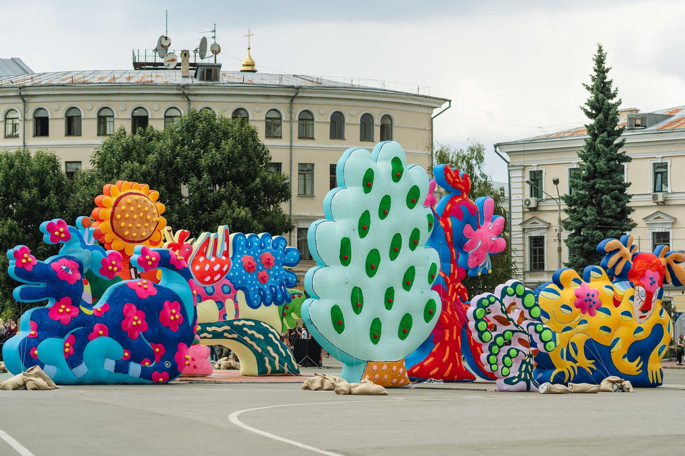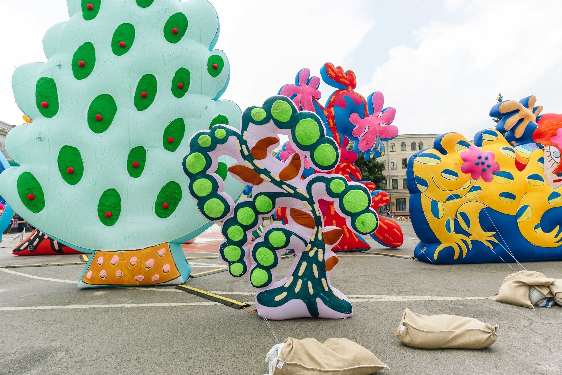 Работа CHIAOZZA — семь пневматических скульптур высотой от 3 до 7 метров, которые переосмысливают известные образы из картин Марии Примаченко: красный цветок, горох, дерево, подсолнух, птица, синий зверь и желтый зверь.