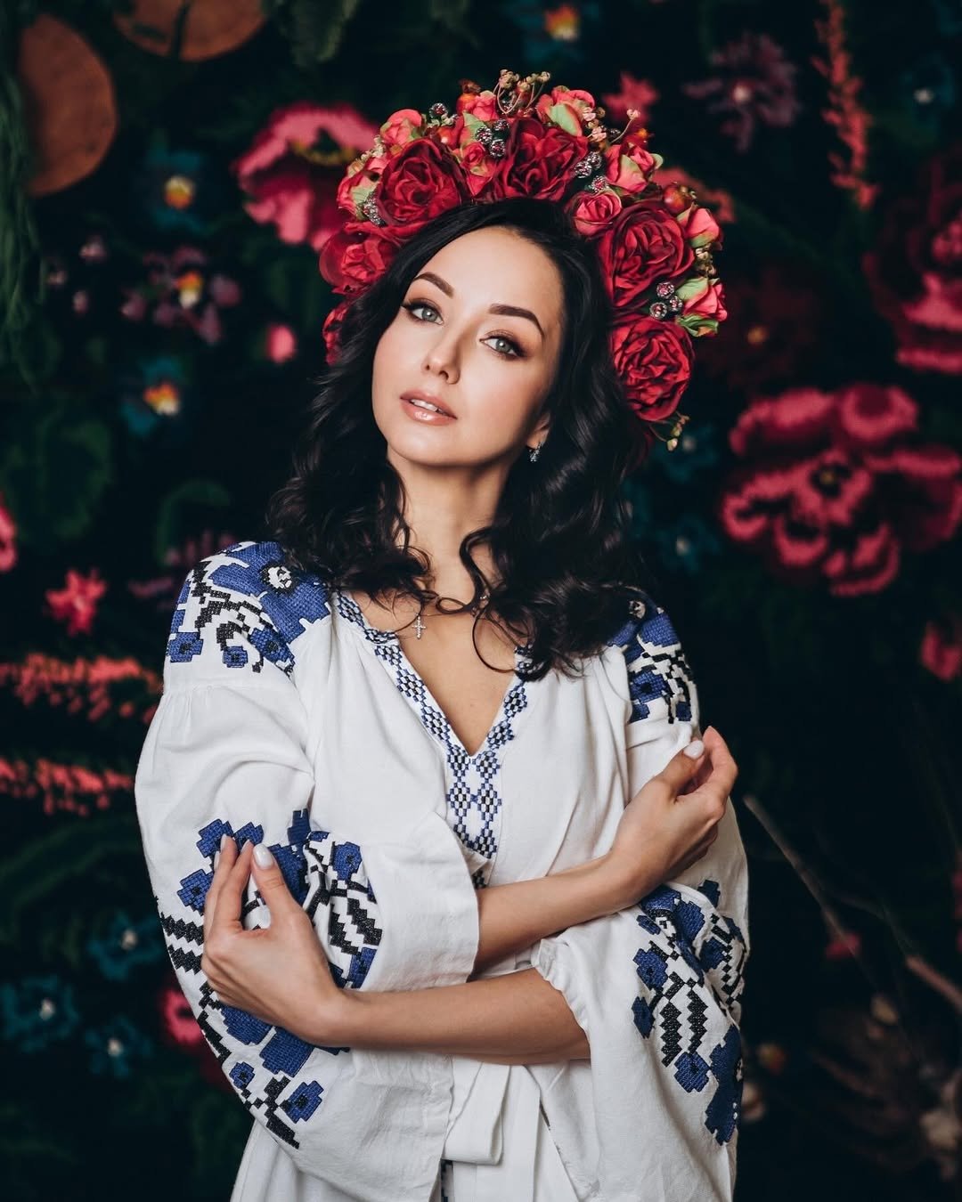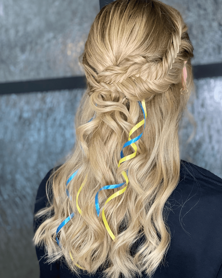 Желто-синие ленты в волосах — самый простой вариант. А еще не забывайте о веночках, ведь с ними очень просто можно создать традиционную украинскую прическу в современном прочтении. Волосы советуем для этого накрутить.