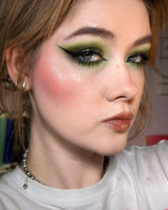 Этот свежий зеленый цвет остается недооцененным, но он может стать твоей изюминкой. Хотя зеленый не так популярен, как классический черный или красный, он прекрасно подчеркивает глаза любого цвета. Попробуй подводку этого оттенка или жидкие тени с глянцевым эффектом — они придадут твоему взору загадочность и блеск.
