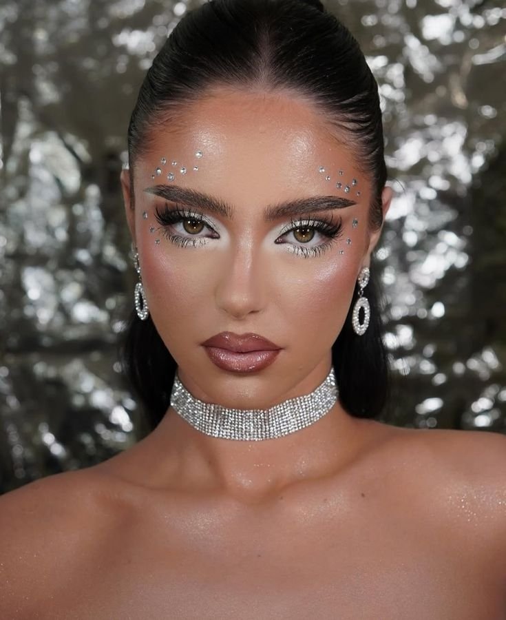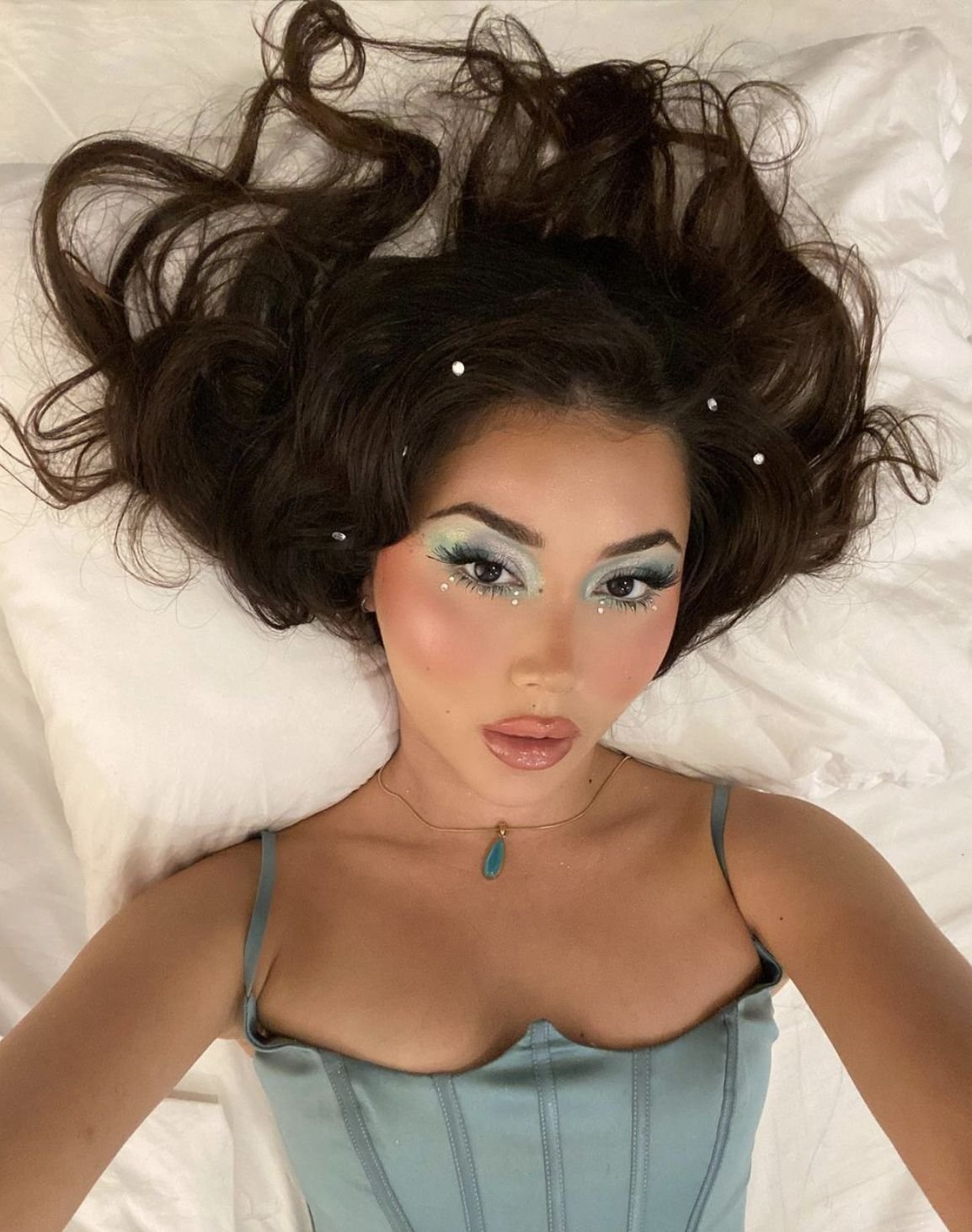 • Не забываем о деталях. Добавить образу особого очарования помогут блестки у глаз, искусственные жемчужины или камни в синих оттенках.