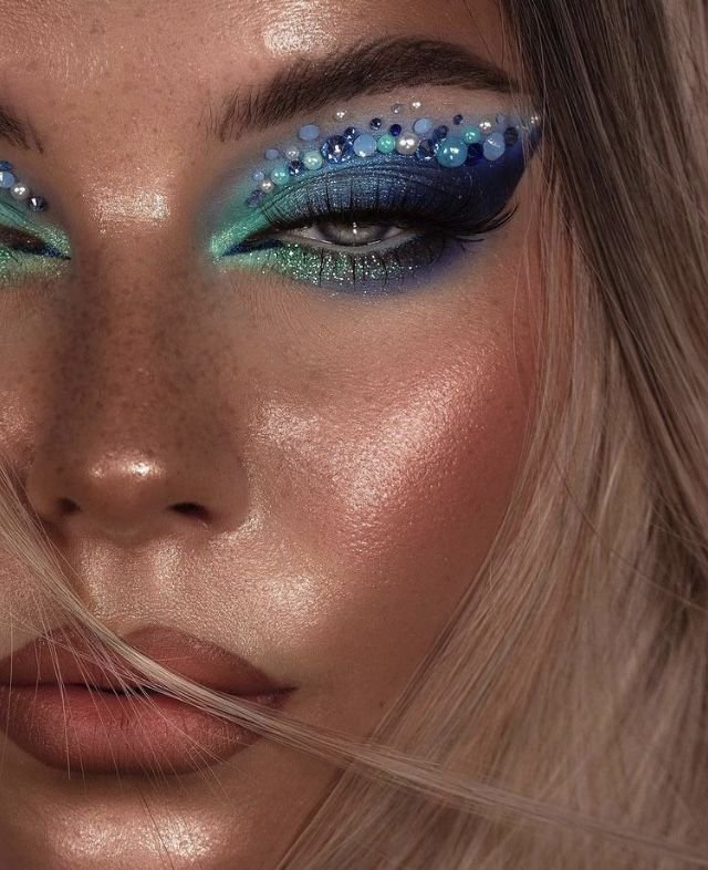 • Глаза. Здесь важно сохранять "морскую" цветовую гамму. Используйте тени в оттенках бирюзы, синего, фиолетового или зеленого. Также не игнорируйте блестки и перламутровые тени.