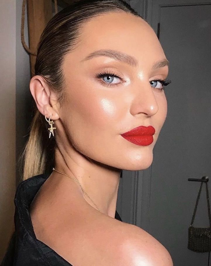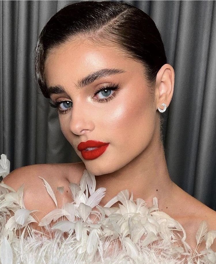 Идеальный тон. Макияж с красными губами требует безупречной кожи, поэтому позаботьтесь о максимальном увлажнении и достаточно плотном покрытии. Не забывайте о румянах, однако делать слишком агрессивный контуринг здесь не стоит.