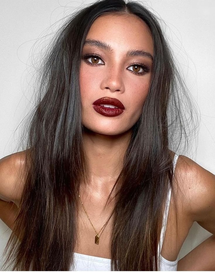 Для начала нужно определиться с оттенком. Блондинкам будут подходить коралловые и ярко-красные оттенки. Брюнеткам лучше выбирать бордовые и классические цвета. А рыжеволосым стоит обратить внимание на кирпичные тона. После этого следует перейти к самому макияжу: